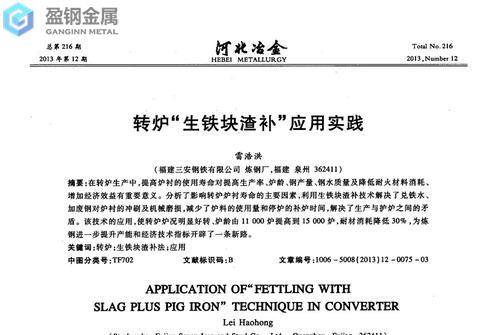 利用生铁块渣补技术可以解决兑铁水、加废钢对炉衬的冲刷及机械磨损,减少炉料的使用量和停炉的补炉时间,解决了生产与护炉之间的莫顿,具有较好的经济效益。